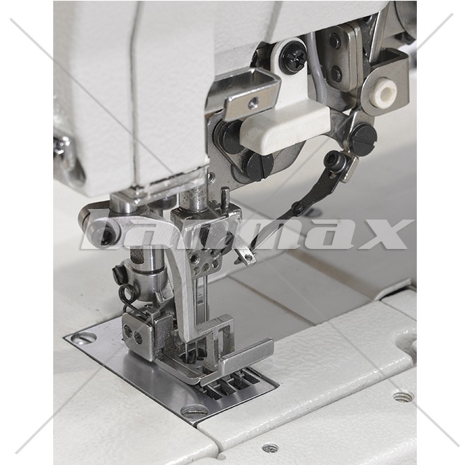 Galoneira de base plana eletrônica com transporte superior e inferior. Base dupla aberta e fechada, 03 agulhas e 05 linhas.