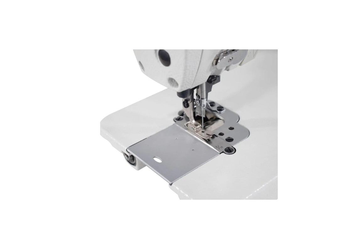 Máquina de costura industrial reta com refilador eletrônica para confecção de vestuário com tecidos médios.