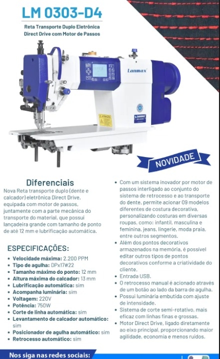 Nova Reta transporte duplo (dente e calcador) eletrônica Direct Drive, equipada com motor de passos, juntamente com a parte mecânica do transporte do material, que possui lançadeira grande com tamanho de ponto de até 12 mm e lubrificação automática.