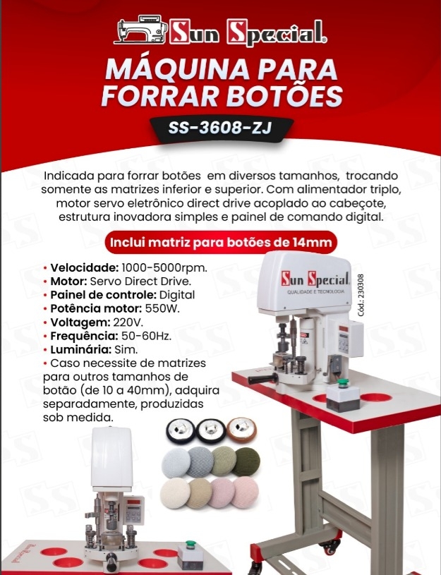Máquina de Costura Industrial Forrar Botões SS-3608-ZJ 220V - Sun Special