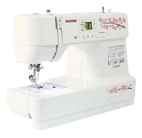 A máquina conta com funções que auxiliam na costura, como botão para arremate automático, botão para costura de retrocesso e botão para subir e descer a agulha.