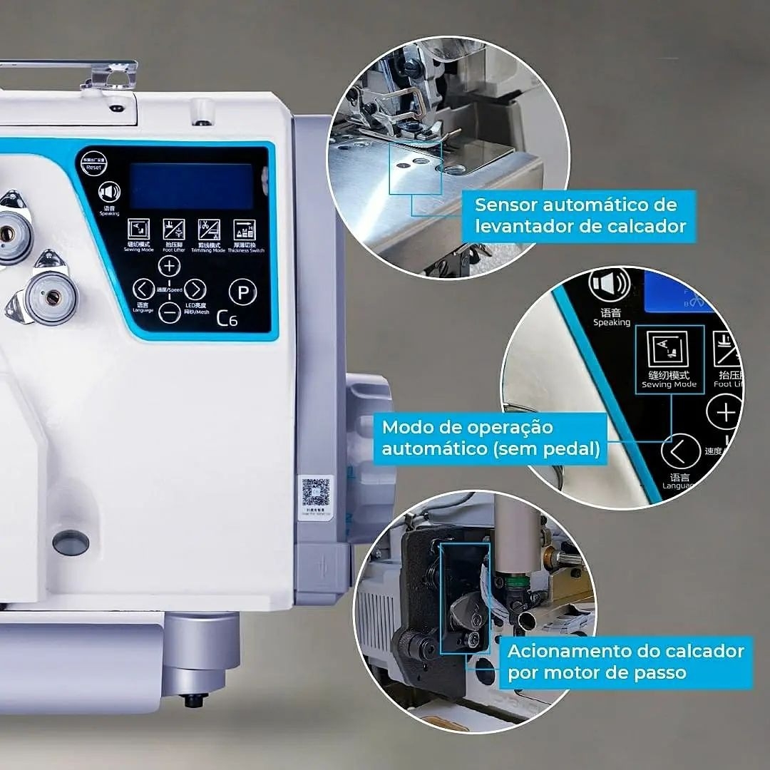 Máquina de costura digital avançada de alta velocidade (7000rpm) com guia de voz. Seletor digital Leve / Médio / Pesado; Reconhecimento automático de materiais e espessuras; Elevador de calcador digital; Corte curto; Fotocélulas para costura automática.