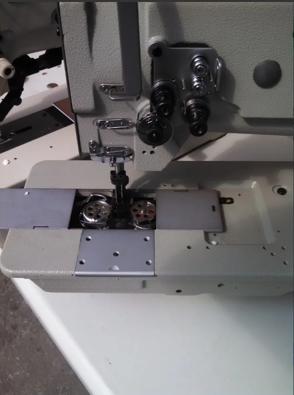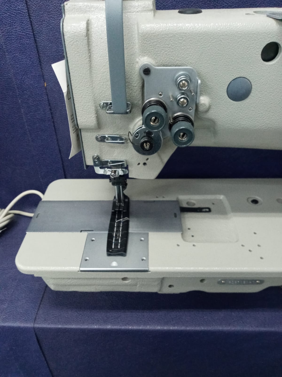 Pespontadeira de 02 agulhas, transporte triplo (dente, agulha e calcador), lançadeira grande vertical e ponto 9mm.